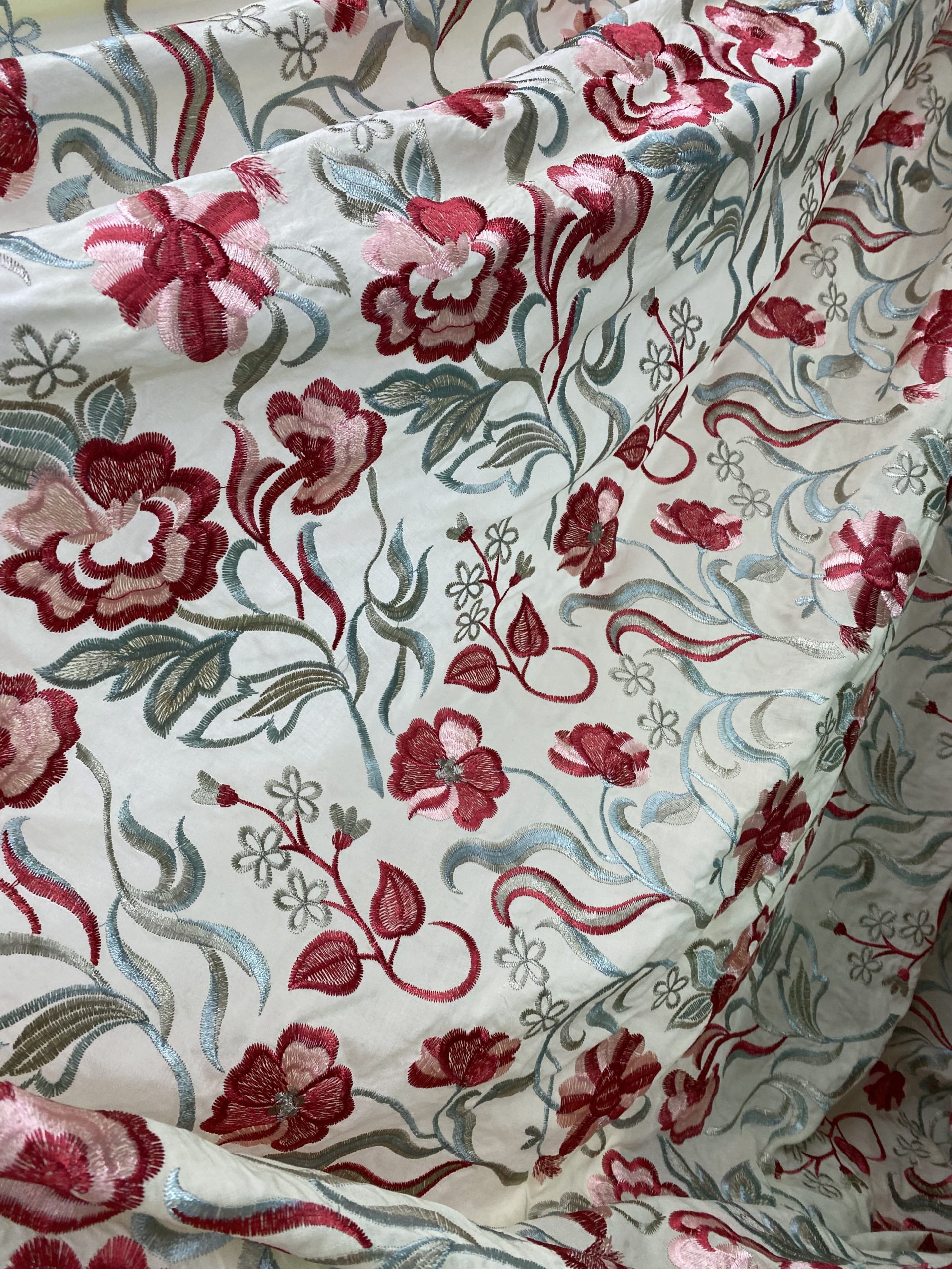Las flores, bordadas con maestría, se presentan en una rica gama de rojos carmesí y fresa, con matices de rosa más suave, que aportan una energía y una profundidad inigualables. Los detalles de hojas y tallos se distinguen en tonos grises azulados y verdes tenues, creando un contraste sofisticado y un juego de colores que realza el diseño floral. El bordado, de textura notable y acabado impecable, confiere cuerpo y movimiento a la tela.