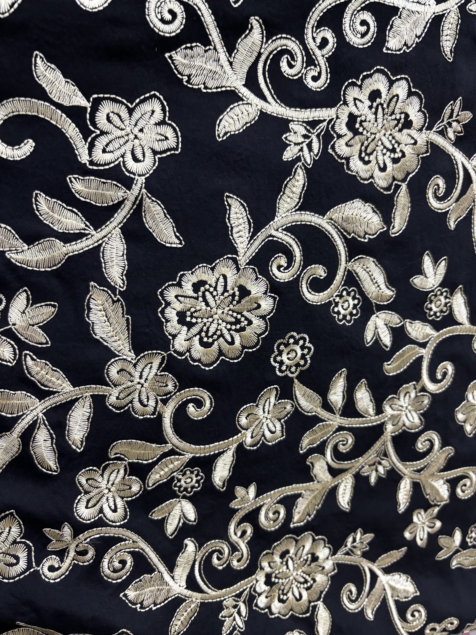 Este impresionante tejido bordado destaca por su contraste atemporal: un fondo negro intenso que resalta cada detalle del bordado floral realizado en hilo dorado. La riqueza de su diseño, compuesto por flores, hojas y arabescos entrelazados, crea una composición armoniosa y sofisticada que capta todas las miradas.