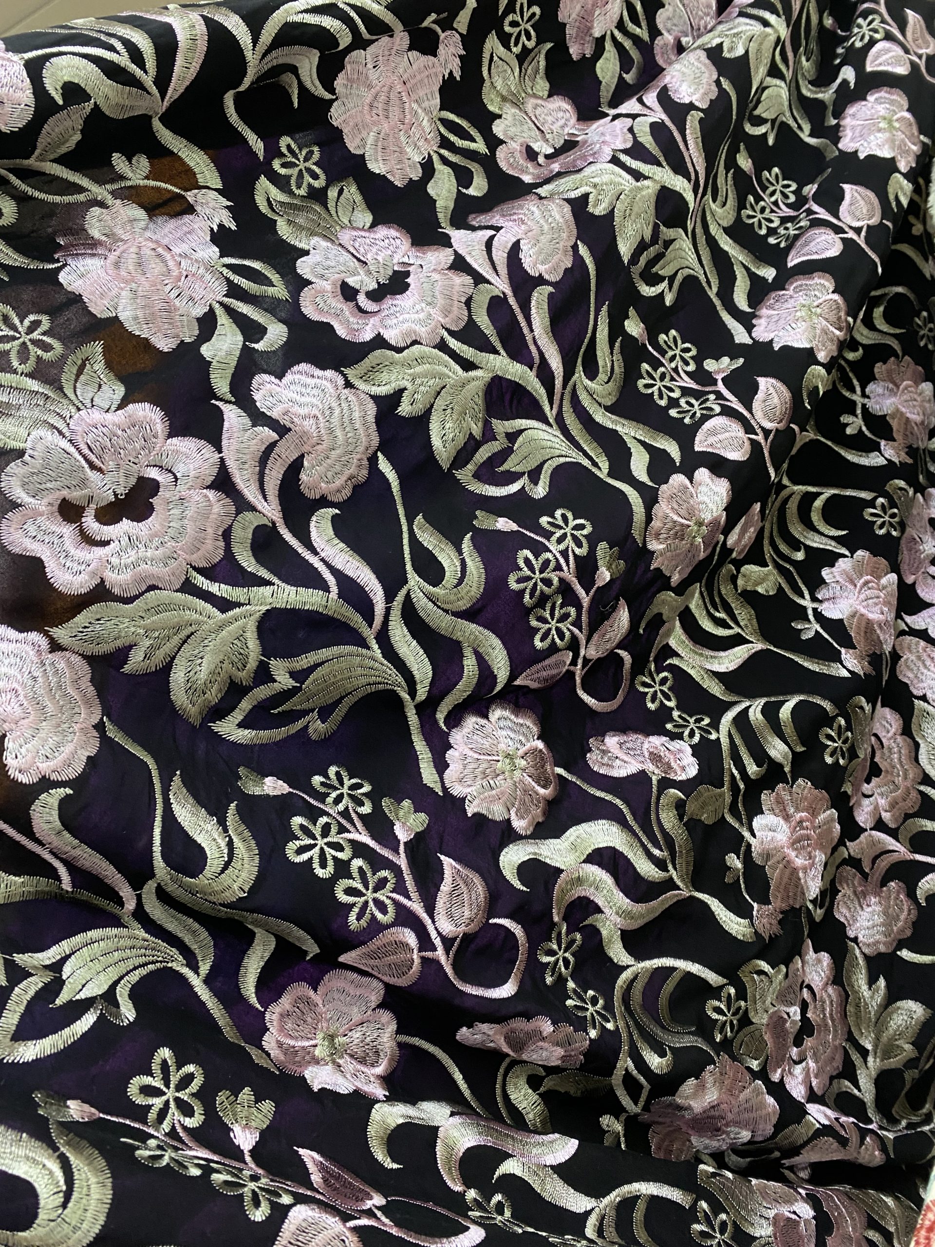 Tela Bordada floral negra  (1.50m): Exquisito bordado floral en tonos rosas, malvas y verdes oliva sobre base negra. Ideal para Mantones de Flamenca, Mantones de Fiesta y Vestidos de Diseño. ¡Calidad y elegancia en cada hilo!