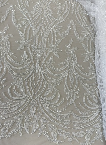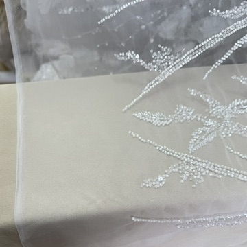 Tul de seda de alta calidad, color blanco, bordado cuidadosamente en cristal para crear un diseño ornamental lleno de movimiento y delicadeza. Sus motivos florales y curvas simétricas aportan un acabado elegante y luminoso. Con puntas diferentes a cada lado del tejido. Colocado sobre base nude, el bordado destaca con un efecto tridimensional que realza la transparencia natural del tul. Ideal para vestidos de novia, cuerpos, sobrefaldas y diseños de alta costura que buscan un acabado sofisticado y brillante.