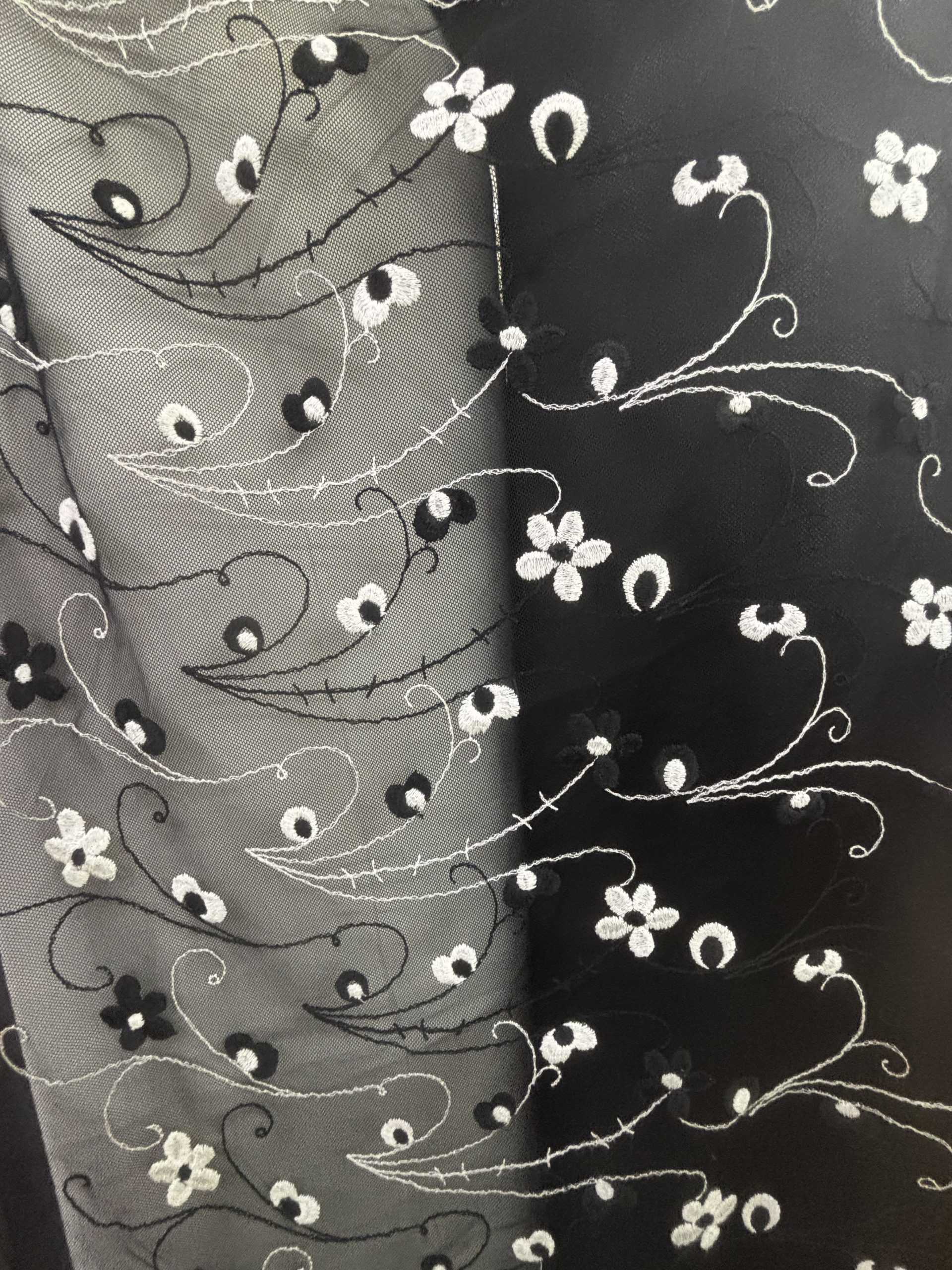 Este exquisito tul de fondo negro se distingue por su delicado bordado floral en hilos blancos y negros, creando un contraste armonioso y elegante. El diseño combina flores y finas líneas bordadas que aportan movimiento y un aire de sofisticación. Es un tejido ligero, vaporoso y con una caída impecable, perfecto para la confección de mantones de flamenca, trajes de diseño, vestidos de fiesta o detalles decorativos. Su estructura permite jugar con transparencias y capas, añadiendo profundidad y estilo a cualquier creación. Fácil de trabajar y adaptable a múltiples usos, es una opción ideal para quienes buscan un acabado refinado y único. Recomendamos su lavado a mano o en programa delicado para conservar la calidad de su bordado.